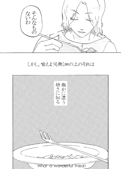フレデリカにちょっとした食べ物の好き嫌いが あったらいいなー、 と ハウリィは斗仙流の修行中は寮生活で フレデリカに滅多に会えないといいなー、 って言う純米の妄想漫画でした。 お粗末様でした! 2005/8/2